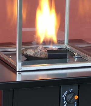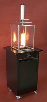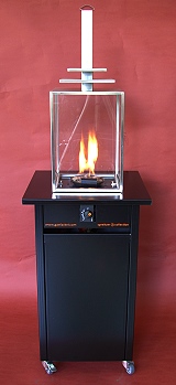 Any room, any terrace, any balcony and any location gets comforting fireplace spirit – next to a table the baseplate is nearly equal in height. Whether “flamelet or flame” – behind glass it feels good and you´ll feel good as well. 150cms high, 47cms wide and mobile by wheels. Manually adjustable – the size of the flame according to your wish. Our example for a mobile gas torch in the style of a fireplace. Fire field with formed mat and stones. Powered by a bottle of liquid gas (LPG) in the bottle case – a model with the name: Kulmbach.