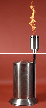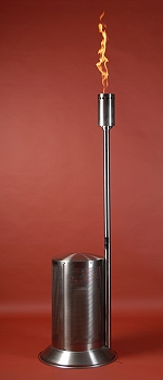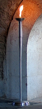 The headhigh torch is suitable for outdoors and for high indoor rooms. With a supporting foot stuck into the ground or fixed on the wall – according to your wishes. The gas cartridge is in the upper part of the torch and can be changed in just a few easy steps. Here you can see the example in stainless steel. The model called Merlin.